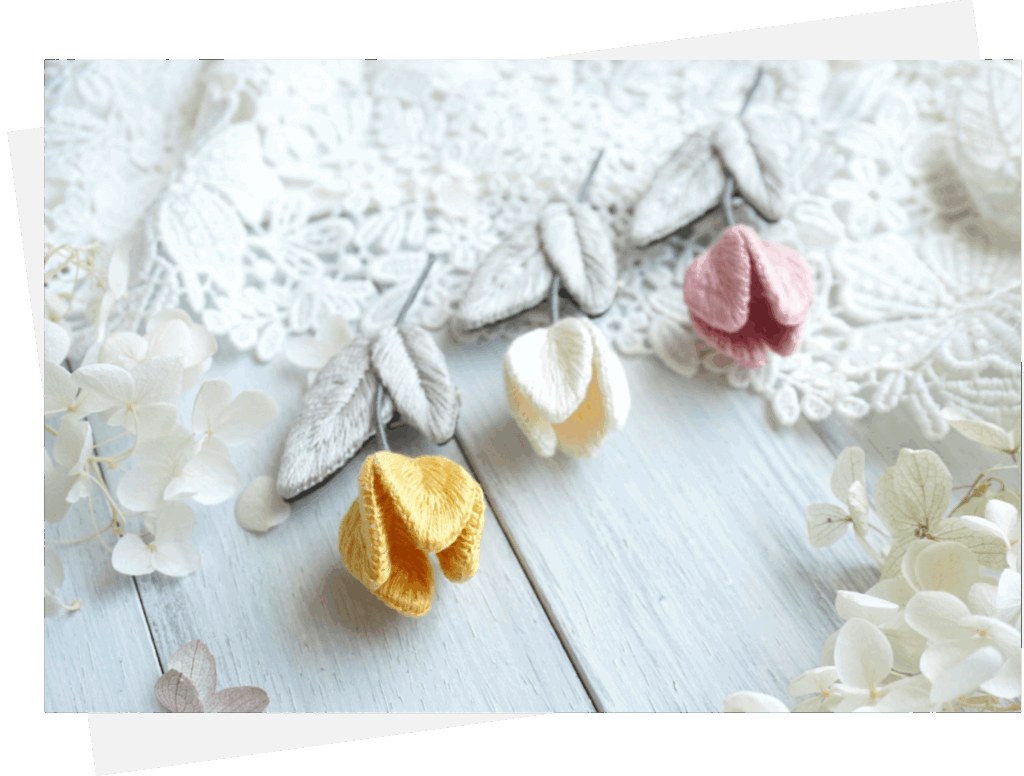 手に取った方の心にも、小さな花が咲くように そんな想いを込めて、ふっくら立体刺繍をお届けしています。