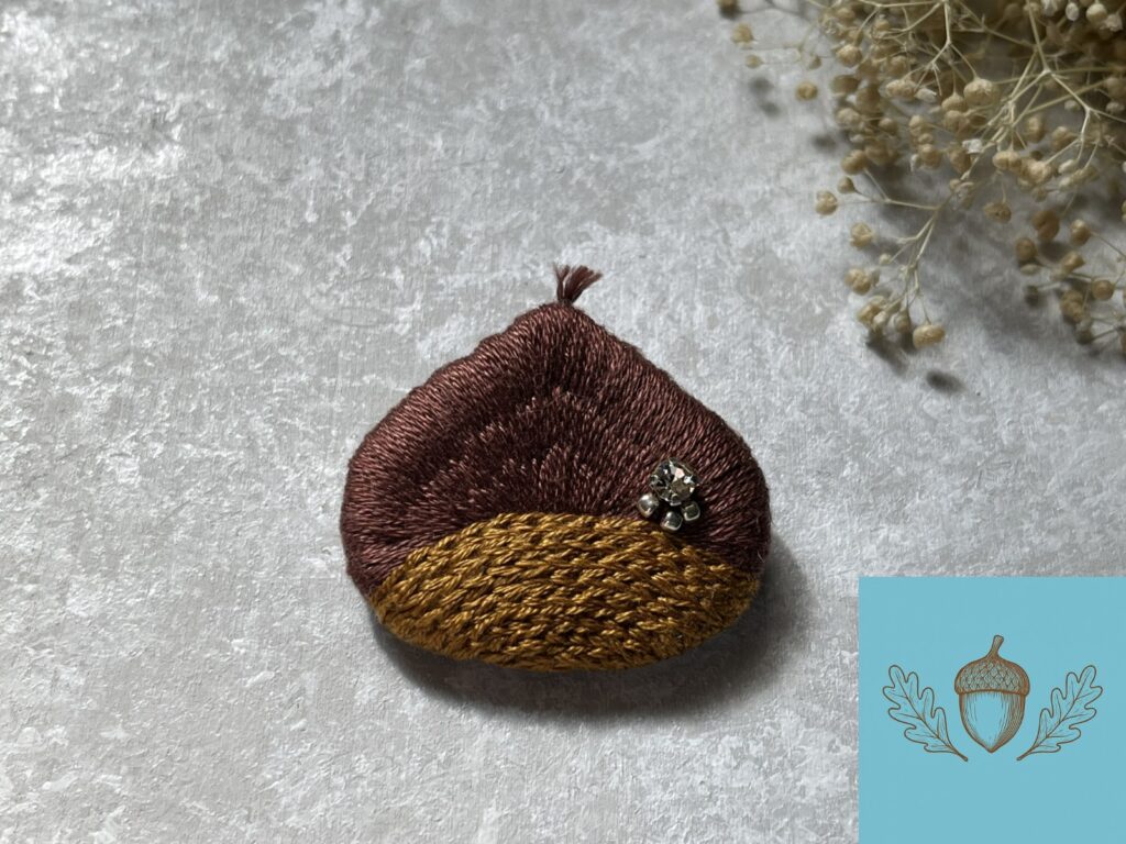 温かみのある落ち着いた色で仕上げ刺繍ならではの優しい温もりをお届けします。ふっくらと立体感のあるどんぐりの刺繍ブローチです。
