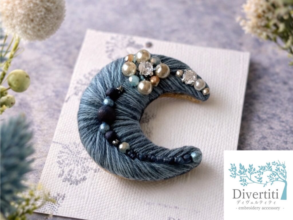 Divertitiは「楽しんで」の想いを込めたブランド。森の宝石を思わせる刺繍ブローチで、大人の装いに上品な煌めきを添えます。
