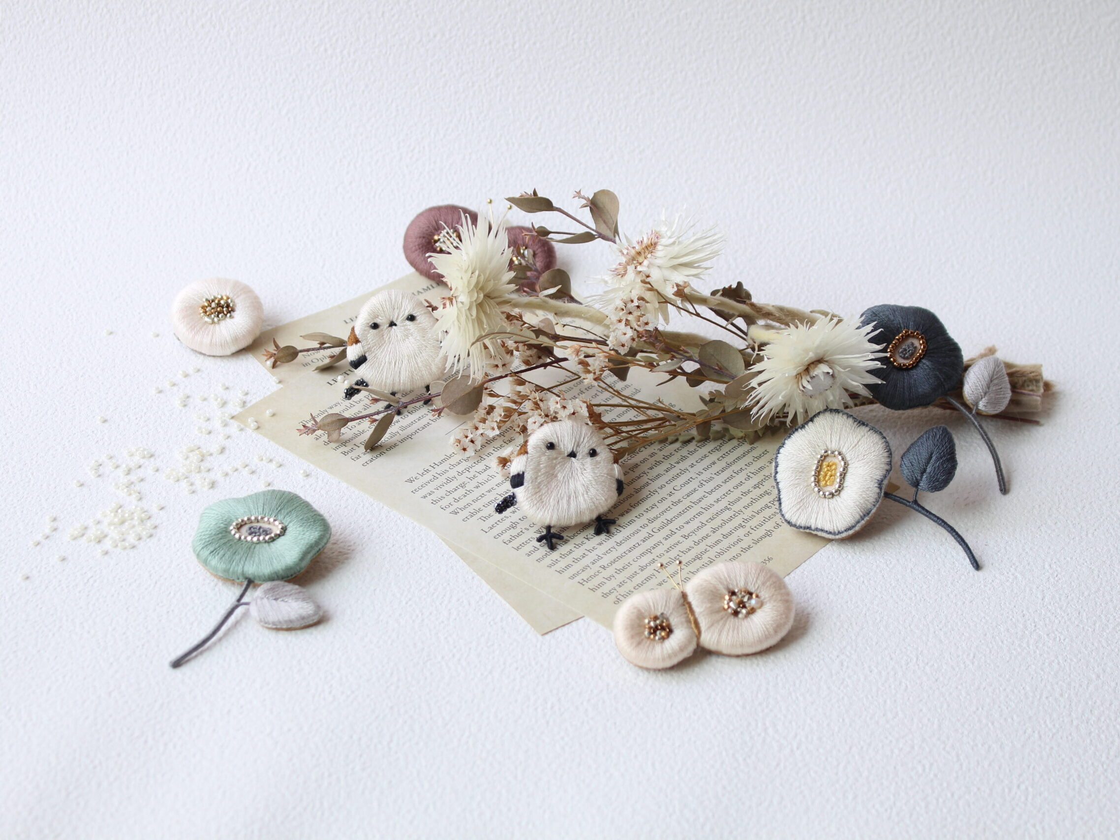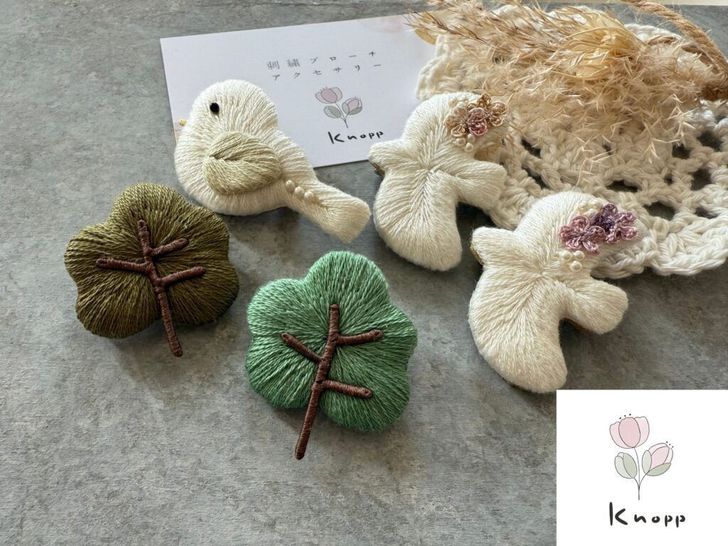 ふっくら立体の小鳥や花を刺繍しています。大人の女性にそっと寄り添う、やさしい刺繍アクセサリーのお店です。
