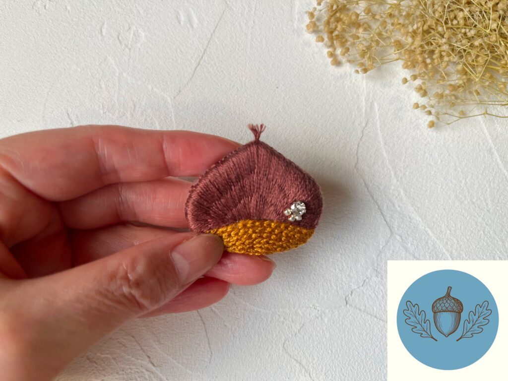温かみのある落ち着いた色で仕上げ刺繍ならではの優しい温もりをお届けします。ふっくらと立体感のあるどんぐりの刺繍ブローチです。