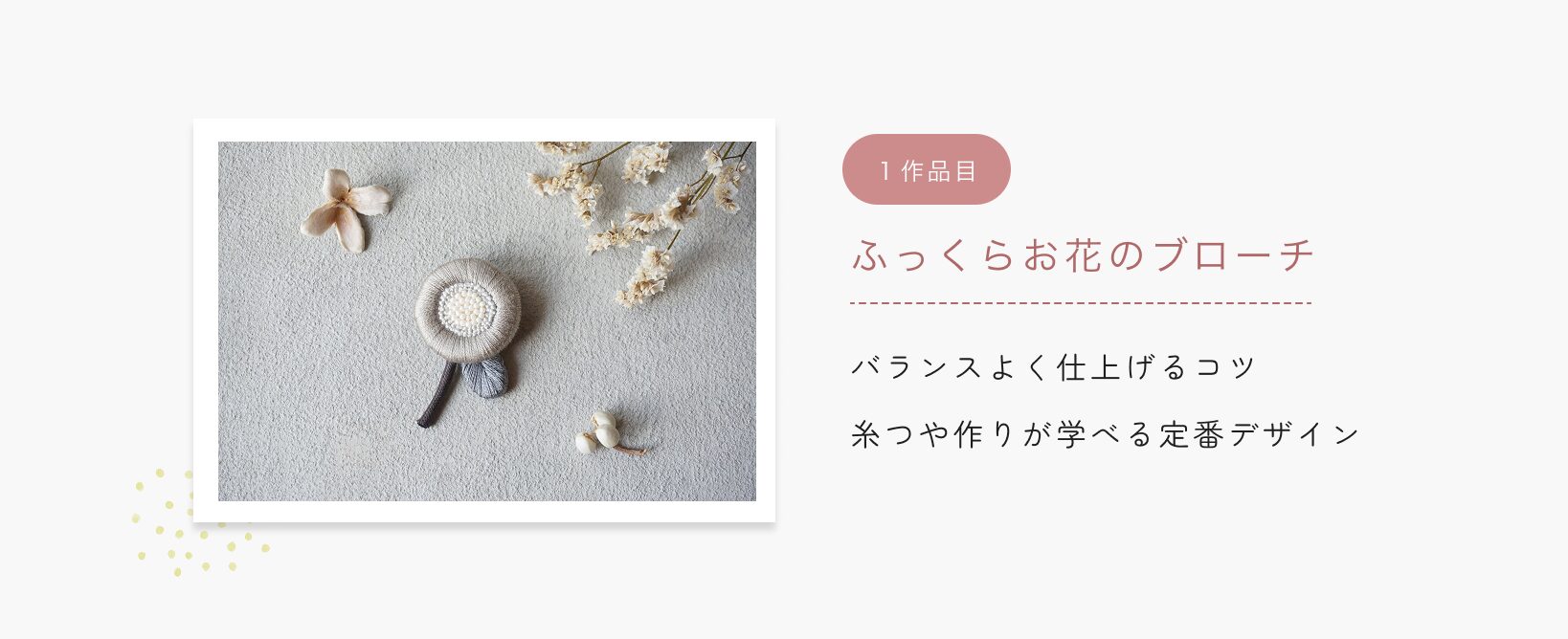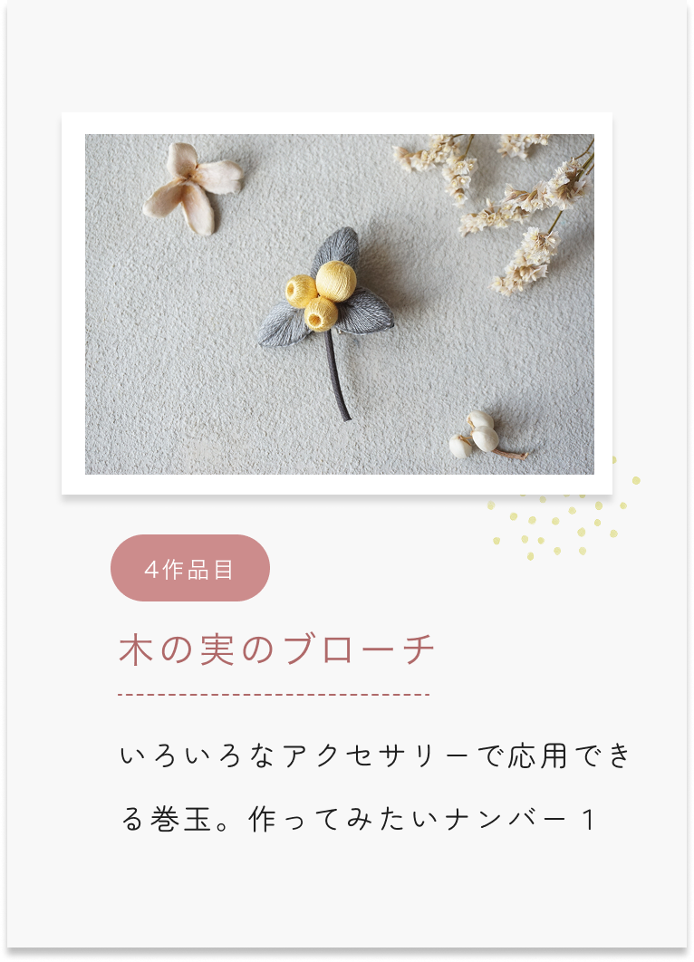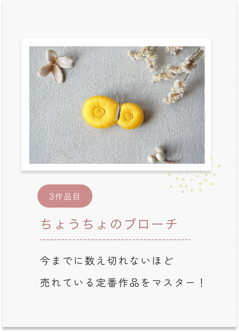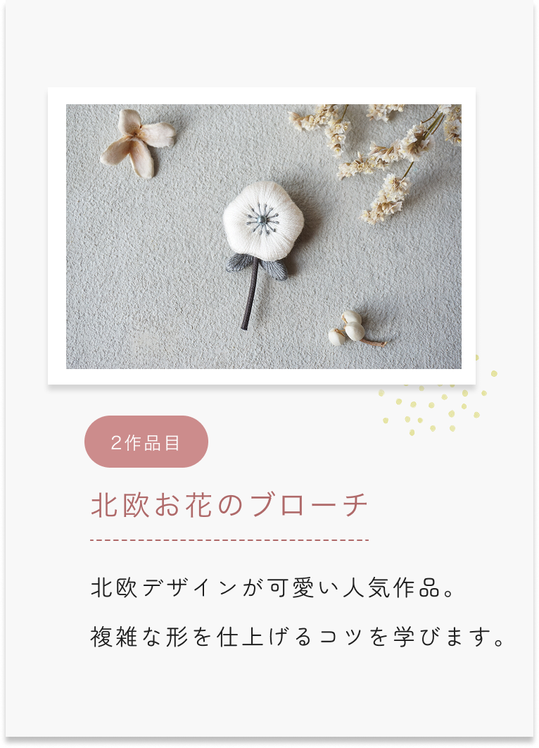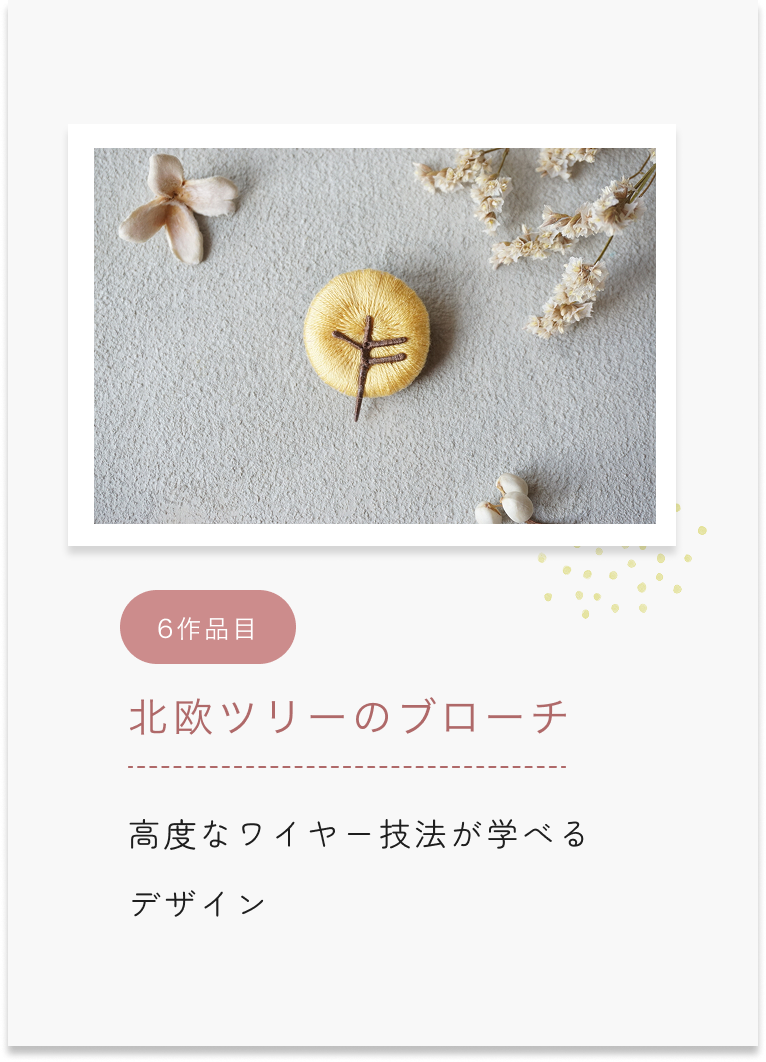 ふっくら立体刺繍の基礎技術をkukkaの人気6作品の制作を通じて学びます。