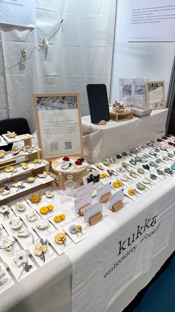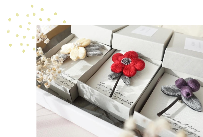 そんな中趣味でハマった刺繍。刺繍ブローチといえばくるみボタンが主流だった頃、立体的な北欧デザインのブローチが欲しいと思い、半ば独学でふっくら立体刺繍を考案しました。